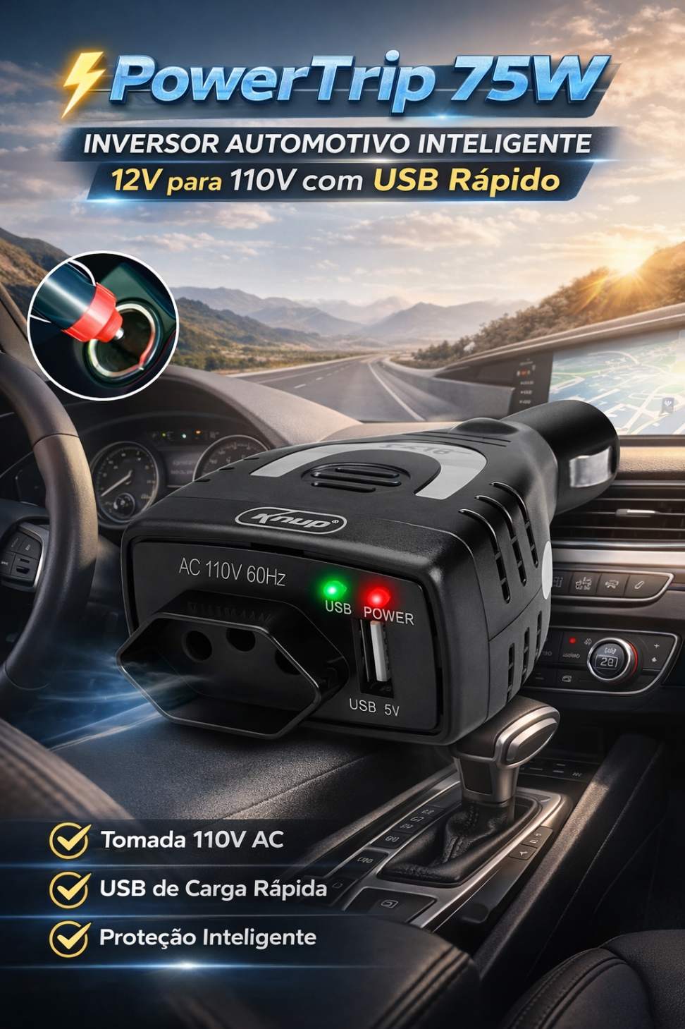 Com o PowerTrip 75W – Inversor Automotivo 12V 110V com USB Rápido, você nunca mais ficará sem energia no caminho.